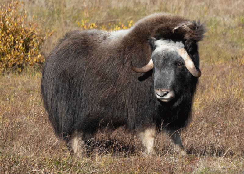 Muskoxen (Ovibos moschatus) are stocky, long-haired mammals with a slight shoulder hump and a very short tail. Both sexes have horns; however, the horns of bulls are larger and heavier than those of cows. The horns of bulls develop large base called a horn boss which nearly spans the entire forehead. Mature bulls are about 5 ft high (1.5 m) at the shoulder and weigh 600–800 lbs (273–364 kg). Cows are smaller, averaging approximately 4 ft (1.2 m) in height and weighing 400–500 lbs (182–227 kg). An 800 lb (364 kg) bull will dress out at about 480 lbs (218 kg), providing roughly 275 lbs (125 kg) of meat.