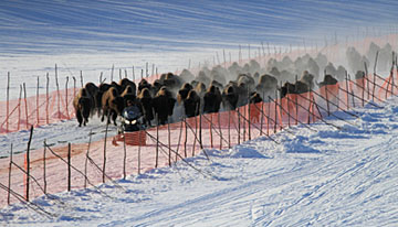 Bison Biologist Seaton opened the gates to the temporary pens and called the bison to follow his snowmobile across the Innoko River to sedge and grass meadows in the Lower Innoko/Yukon Rivers area which will become their new home. Bison galloped behind the snowmobile all the way across the river to the sedge meadow, a distance of nearly a mile.