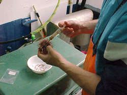 Jump to species: Abalone, Pinto Albatross, Black-footed Albatross, Short-tailed Bat, Little Brown Myotis Bat, Silver-haired Bat, Western Long-Eared Bear, Black Bear, Brown Bear, Polar Beaver Bison, Plains Bison, Wood Burbot Caribou Char, Arctic Char, Dolly Varden Char, Lake Chickadee, Black-capped Chickadee, Boreal Chickadee, Chestnut-backed Chickadee, Gray-headed Cisco, Arctic Cisco, Bering Cisco, Least Clam, Geoduck Clam, Littleneck Clam, Razor Coyote Crab, Blue King Crab, Dungeness Crab, Golden King Crab, Red King Crab, Tanner Crane, Sandhill Curlew, Eskimo Deer, Mule Deer, Sitka Black-tailed Dipper, American Dolphin, Pacific white-sided Duck, Harlequin Eagle, Bald Eagle, Golden Eider, Spectacled Eider, Steller's Elk, Roosevelt Ermine Eulachon Fisher Fox, Arctic Fox, Red Frog, Columbia Spotted Goat, Mountain Goose, Canada Goose, Emperor Goshawk, Northern Grayling, Arctic Grouse, Ruffed Grouse, Sharp-tailed Grouse, Sooty Hagfish Halibut, Pacific Hare, Alaska Hare, Snowshoe Herring, Pacific Knot, Red Lamprey, Arctic Lamprey, Pacific Lamprey, Western River Lemming, Northern Collared Lingcod Loon, Yellow-billed Lynx Mackerel, Atka Marmot, Alaska Marmot, Hoary Marmot, Woodchuck Marten, American Marten, Pacific Mink, American Moose Murrelet, Kittlitz's Murrelet, Marbled Muskox Muskrat Newt, Roughskin Octopus, Giant Pacific Osprey Otter, Northern Sea Otter, River Owl, Barred Owl, Boreal Pika, Collared Pike, Northern Pollock, Walleye Porcupine, North American Porpoise, Dall's Porpoise, Harbor Ptarmigan, Rock Ptarmigan, Willow Raven, Common Reindeer, Santa's Rockfish, Black Rockfish, Yelloweye Sablefish Salmon, Chinook Salmon, Chum Salmon, Coho Salmon, Pink Salmon, Sockeye Scallop, Weathervane Sea Cucumber, Red Sea Lion, Steller Sea Urchin, Red Seal, Bearded Seal, Harbor Seal, Northern Fur Seal, Ringed Shark, Salmon Sheefish Sheep, Dall Shrimp, Coonstripe Shrimp, Northern Shrimp, Sidestriped Shrimp, Spot Smelt, Longfin Smelt, Pond Smelt, Rainbow Squirrel, Arctic Ground Squirrel, Northern Flying Squirrel, Red Swan, Trumpeter Toad, Western Trout, Cutthroat Trout, Steelhead / Rainbow Turtle, Green Sea Turtle, Leatherback Sea Turtle, Loggerhead Sea Turtle, Olive Ridley Sea Vole, Meadow Vole, Red-Backed Walrus, Pacific Whale, Beluga Whale, Gray Whale, Humpback Whale, Killer Whale, North Pacific Right Whale, Sperm Whitefish, Broad Whitefish, Humpback Wolf Wolverine Printer friendly Red Sea Urchin (Mesocentrotus franciscanus) Research Description Uses Management Research More Resources See Southeast Commercial Dive Fisheries for red sea urchin research. Facebook Twitter Google+ Reddit