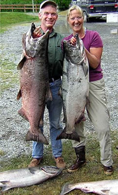 The Kenai River supports major runs of king, sockeye, coho, and pink salmon, but is best known for its king salmon. Kenai River king salmon are highly prized among anglers. Relative to other king salmon stocks, Kenai River king salmon are large, often weighing more than 40 pounds. The Kenai River king salmon also holds the present world record for the largest sport-caught king salmon—weighing in at 97 pounds. King salmon runs begin in mid-May and overlap with sockeye salmon runs, which begin to arrive in late May, and coho and pink salmon runs which begin arriving in mid to late July.
