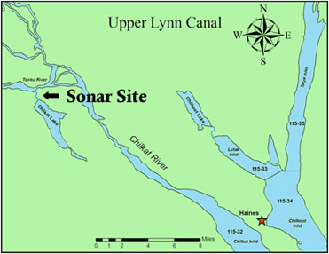 The Chilkat sonar site is located a half mile downstream of Chilkat Lake on a 100-foot wide slough and about 20 miles northwest of the city of Haines. The slough connects the lake to Tsirku River and consists of a single counting station on one side. Chilkat Lake and Tsirku River are part of the Chilkat River drainage. Tsirku River is Chilkat River’s second biggest tributary and Chilkat Lake is the primary spawning destination for Chilkat River sockeye salmon.