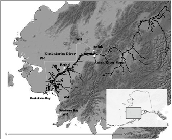 The Aniak River drains from the Aniak Lake basin, flowing about 80 river miles northward before emptying into the Kuskokwim River one mile upstream from the community of Aniak. The Kuskokwim River is the second largest river in Alaska, draining an approximately 51,000 square mile area or 11 percent of the land area of Alaska. The river drains from the northwestern slope of the Alaska Range, flowing approximately 930 river miles westward to Kuskokwim Bay where it empties into the Bering Sea.