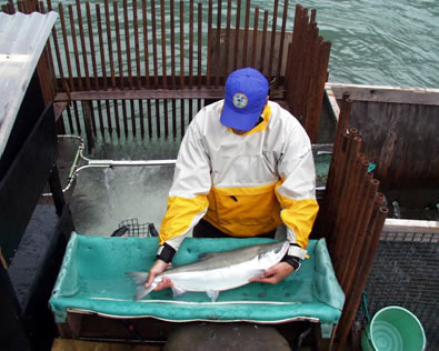 Technicians catch a sample of the returning salmon by temporarily closing the weir and netting the backed up salmon behind it. By examining the proportion of coho to sockeye salmon in the catch, ADF&G can estimate what proportion of the sonar-detected fish should be counted as sockeye salmon.