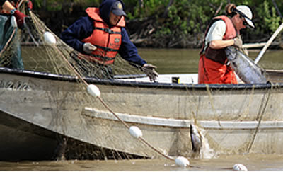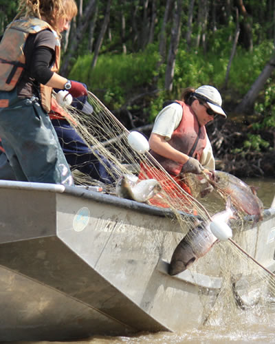 In addition to helping biologists separate sonar-detected fish by species, the gillnet project also collects data that helps them track trends in king and chum salmon runs. While gillnetting, crew document fish length and sex, and collect scale samples for aging fish and tissue samples for determining the genetic composition of the run. A tissue sample is taken by clipping an enlarged pointed scale at the base of the pelvic fin known as the axilary process. The Pilot Station site is the only sonar site in Alaska where tissues collected for genetic analyses are used for inseason management. The samples are used to provide biologists with information about where in the drainage sampled king and chum salmon are migrating to.