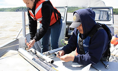 When lower Yukon River water levels rise, currents sometimes carry sediment downstream in a thick band of silt. At the sonar site, a silt band sometimes flows along the site’s left bank and, like a curtain, hides fish from shore-based sonar transducers. But starting in 2010 fisheries biologists adopted a new tool to peek behind the curtain of silt-side-scan sonar. Now when a band of silt along the left bank blocks shore-based sonar from detecting fish, sonar site crew can observe fish on the other side of the band by looking down into the water from a boat using the side-scan sonar. The transducer emits sound waves toward the river bottom looking for fish in a 720-foot wide area perpendicular to the bank. Cables connect the transducer to a laptop computer that displays detected fish with images similar to the fish traces displayed by split-beam sonar (see Site Sonar Tools). The side-scan sonar could become an invaluable backup tool when a severe silt band occurs, as it did in 2009. Heavy flooding during spring breakup in 2009, created a silt band that blocked fish detection off the left bank and prompted ADF&G to purchase the side-scan sonar in 2010.