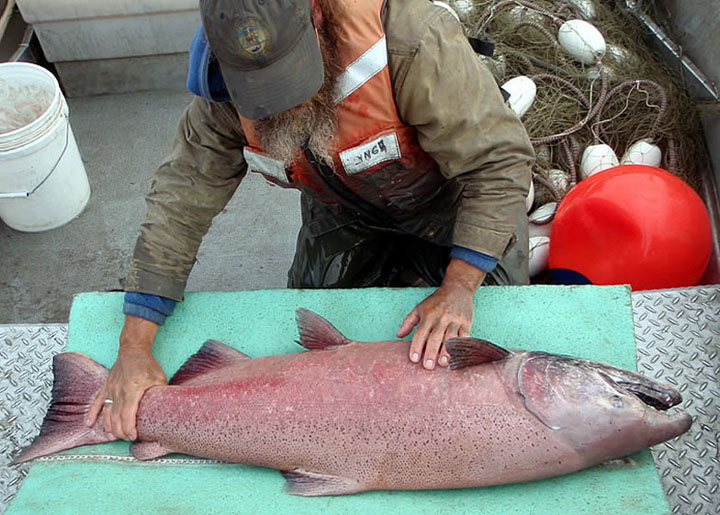 In addition to providing an indication of when the run has shifted from king to chum salmon, gillnet catches provide technicians with an opportunity to collect salmon profile data. For each salmon captured, technicians measure length, identify gender and take a scale and tissue sample. Scales are processed to determine age and tissue samples used to determine genetic stock composition. Each year site technicians collect this data from a sample of about 480 kings and 640 chum salmon.