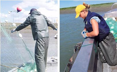 In the lower Kenai River at River Mile (RM) 9, ADF&G crews drift gillnets every day from mid-May to mid-August. To minimize injuring king salmon, they use undersized mesh nets and never remove captured king salmon from the water. The crew collects information that includes fish species, length, and sex, as well as scale samples to determine age. Catch rates provide biologist with an indication of run strength. Data on fish length and the relative proportion of large kings, small kings and sockeye in the gillnet catches helps biologists determine post season how many small, sonar-detected fish should be classified as king salmon rather than sockeye salmon.
