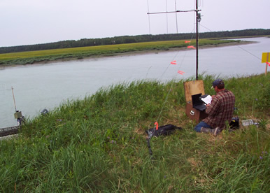 In 2010 ADF&G began a multi-year project to track early and late king salmon migrations up the Kenai River with radio tags. At the Kenai king salmon sonar site, sonar site crew place the tags in the stomachs of king salmon caught in the inriver gillnets. Biologists then track the radio tagged fish with boats, from the air and with ground stations that detect and record fish passage. When the project is complete, biologists can analyze the collected data to provide an independent estimate of abundance to compare with the estimates generated using sonar at the king salmon site.