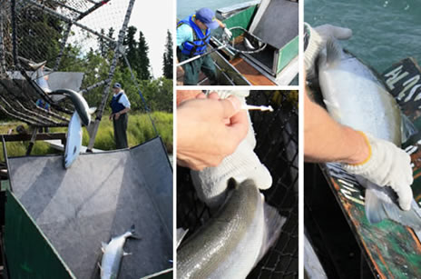 Even when the sonar site does not need fish wheel catches to separate sonar-detected fish by species, ADF&G runs the fish wheel every day to collect data from sockeye salmon. ADF&G technicians collect sex and length data, and scale samples from the fish. ADF&G biologists use the scale samples to determine the age of the fish and use this and the length and sex data to identify trends in returning sockeye runs from year to year.