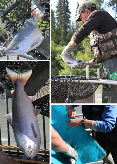Estimating the abundance of a particular species of salmon in a river is easiest when they are not mixed with other fish species. Since sonar cannot identify fish by species, almost all Alaska Department of Fish and Game sonar sites use either gillnets or fish wheels to separate sonar-detected fish by species. At the Yentna River sonar site, ADF&G uses a fish wheel along each bank. Fish wheels capture fish by scooping them out of the river with large baskets and depositing them into a live box. The relative proportion of sockeye salmon to other species caught in the fish wheel is then examined to determine how many of the sonar-detected fish should be counted as sockeye salmon.