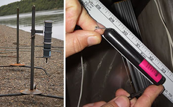 As part of the project, acoustics specialists have used two types of boat-mounted sonar to create bathymetry and water velocity maps of the river channel in which the hydrophones are tracking tagged king salmon. The maps will help biologist better understand king salmon migrations through the channel because fish often orientate their swimming patterns according to river bottom features and variations in water velocity. They might, for example, use a submerged sand bar to cross from one side of the river to the other or to swim further off shore. And as a general rule, migrating fish swim in areas where they face slower velocity, such as along the river bottom. Fisheries biologists working on the project are also using a type of boat-mounted sonar known as side-scan sonar to produce almost photo-like images of the river bottom sediments and grasses, that can also capture images of fish migrating past.