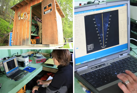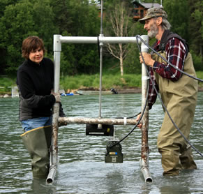 At most sonar sites in Alaska, ADF&G biologists use sonar to sample over time rather than run sonar continually. At the Kenai River, technicians record 10-minute sonar snapshots each hour along each bank, expand the counts to hourly estimates and then sum the hourly estimates to produce a full 24-hour estimate. Research has found the difference in estimates generated while running sonar continually and estimates generated while sampling is very small. But the difference in operational costs is huge (see sampling methods study).