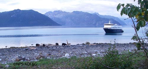 A cruise ship watches as a mixed group of brown bears and wolves feeds at the carcass in late August.