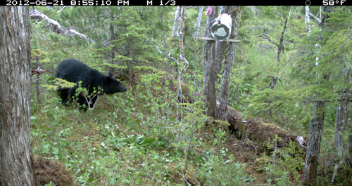 A black bear explores a snare on Prince of Wales (POW) Island. This bear manages to trip the snare without getting caught. A trail camera catches the details. Biologists are catching bears on POW and equipping them with GPS collars. Since the summer of 2010, 55 bears on POW have been equipped with GPS or VHF radio collars to learn more about their life history.