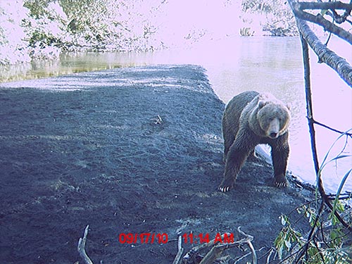 ADF&G wildlife technician Jeff Jemison aimed a remote trail camera at the carcass of a dead moose north of Juneau in the spring of 2010 and drew in a bear that had recently emerged from hibernation. -