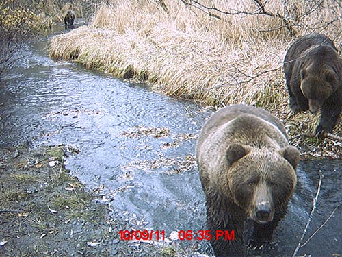 Robin Overall of Kodiak places her trail cameras on established bear trails, in view of rub trees, and near streams. She provided an amazing assortment of images featuring the famed Kodiak brown bears. -
