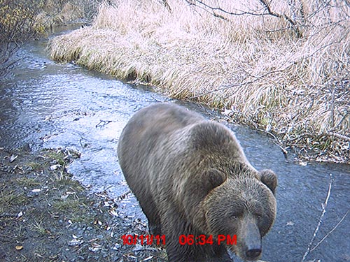 ADF&G wildlife technician Jeff Jemison aimed a remote trail camera at the carcass of a dead moose north of Juneau in the spring of 2010 and drew in a bear that had recently emerged from hibernation.