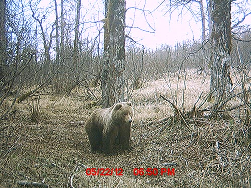 ADF&G wildlife technician Jeff Jemison aimed a remote trail camera at the carcass of a dead moose north of Juneau in the spring of 2010 and drew in a bear that had recently emerged from hibernation. -