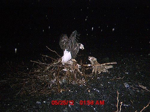 A scavenger smackdown. Bear hunters covered up a carcass and it was not found by other bears. "I thought, as did the hunters, that a bear would come and take it away. Nope, that carcass sat there for over a month and not a single bear came, just lots of foxes and eagles finally picked it clean," Robin wrote. "The eagle and fox fighting went on for about 30 images, that eagle did not give up his perch."