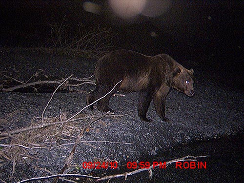 ADF&G wildlife technician Jeff Jemison aimed a remote trail camera at the carcass of a dead moose north of Juneau in the spring of 2010 and drew in a bear that had recently emerged from hibernation. -