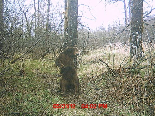 Robin Overall of Kodiak places her trail cameras on established bear trails, in view of rub trees, and near streams. She provided an amazing assortment of images featuring the famed Kodiak brown bears. -
