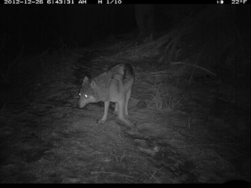 In December 2012, Olivia Fletcher of Juneau began a science fair project looking at red squirrel habitat use and preferences. Two USFWS scientists helped mentor her work, and provided a remote, motion-triggered trail camera for the study. While she did get some pictures of squirrels, she captured some surprising images of wolves in the forest adjacent to downtown Juneau. The infra-red flash renders the images in black and white.