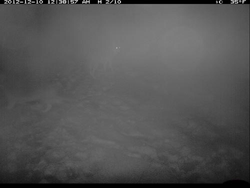 In December 2012, Olivia Fletcher of Juneau began a science fair project looking at red squirrel habitat use and preferences. Two USFWS scientists helped mentor her work, and provided a remote, motion-triggered trail camera for the study. While she did get some pictures of squirrels, she captured some surprising images of wolves in the forest adjacent to downtown Juneau. The infra-red flash renders the images in black and white.