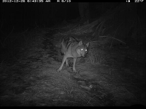 In December 2012, Olivia Fletcher of Juneau began a science fair project looking at red squirrel habitat use and preferences. Two USFWS scientists helped mentor her work, and provided a remote, motion-triggered trail camera for the study. While she did get some pictures of squirrels, she captured some surprising images of wolves in the forest adjacent to downtown Juneau. The infra-red flash renders the images in black and white.