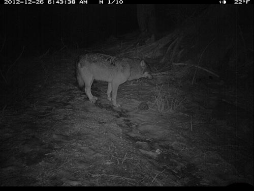 In December 2012, Olivia Fletcher of Juneau began a science fair project looking at red squirrel habitat use and preferences. Two USFWS scientists helped mentor her work, and provided a remote, motion-triggered trail camera for the study. While she did get some pictures of squirrels, she captured some surprising images of wolves in the forest adjacent to downtown Juneau. The infra-red flash renders the images in black and white.