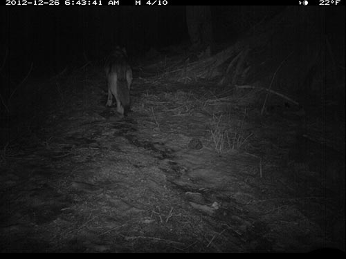 In December 2012, Olivia Fletcher of Juneau began a science fair project looking at red squirrel habitat use and preferences. Two USFWS scientists helped mentor her work, and provided a remote, motion-triggered trail camera for the study. While she did get some pictures of squirrels, she captured some surprising images of wolves in the forest adjacent to downtown Juneau. The infra-red flash renders the images in black and white.