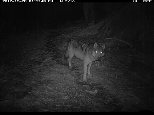 In December 2012, Olivia Fletcher of Juneau began a science fair project looking at red squirrel habitat use and preferences. Two USFWS scientists helped mentor her work, and provided a remote, motion-triggered trail camera for the study. While she did get some pictures of squirrels, she captured some surprising images of wolves in the forest adjacent to downtown Juneau. The infra-red flash renders the images in black and white.