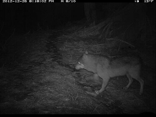 In December 2012, Olivia Fletcher of Juneau began a science fair project looking at red squirrel habitat use and preferences. Two USFWS scientists helped mentor her work, and provided a remote, motion-triggered trail camera for the study. While she did get some pictures of squirrels, she captured some surprising images of wolves in the forest adjacent to downtown Juneau. The infra-red flash renders the images in black and white.
