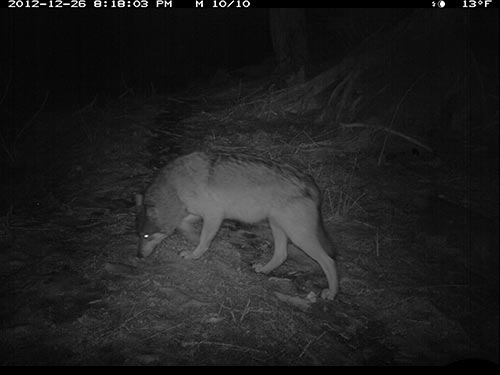 In December 2012, Olivia Fletcher of Juneau began a science fair project looking at red squirrel habitat use and preferences. Two USFWS scientists helped mentor her work, and provided a remote, motion-triggered trail camera for the study. While she did get some pictures of squirrels, she captured some surprising images of wolves in the forest adjacent to downtown Juneau. The infra-red flash renders the images in black and white.