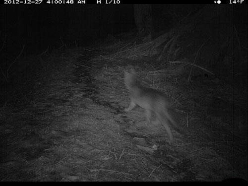 Next morning, about eight hours later, Dec. 27 at 4 a.m., wolf comes down trail from behind camera and moves through frame.