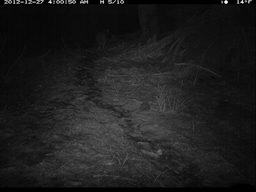 Next morning, about eight hours later, Dec. 27 at 4 a.m., wolf comes down trail from behind camera and moves through frame.