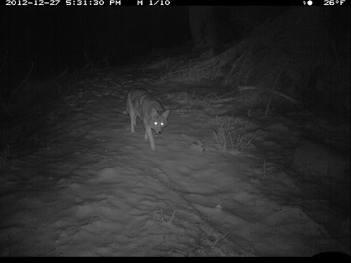 Later that day after snowfall, 5:31 pm Dec. 27, wolf comes down trail toward camera.