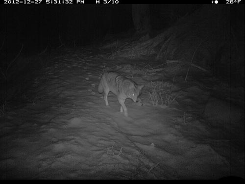 Later that day after snowfall, 5:31 pm Dec. 27, wolf comes down trail toward camera.