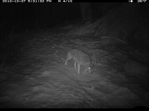 Later that day after snowfall, 5:31 pm Dec. 27, wolf comes down trail toward camera.