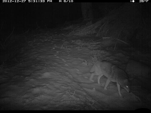 Later that day after snowfall, 5:31 pm Dec. 27, wolf comes down trail toward camera.