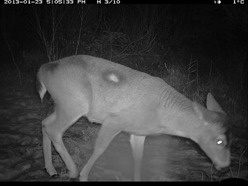 Jan. 23, 5 pm, different location, Black-tailed deer crosses in front of camera, has an odd white spot or patch on ride side.