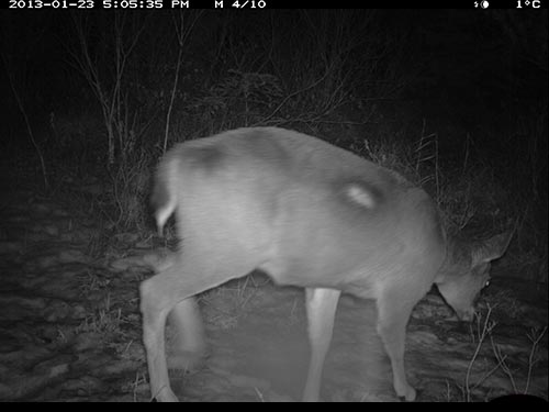 Jan. 23, 5 pm, different location, Black-tailed deer crosses in front of camera, has an odd white spot or patch on ride side.