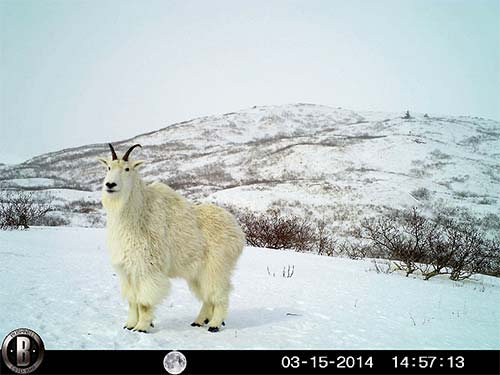 Robin Overall of Kodiak is an avid and skilled trail camera photographer. She shared nine pictures taken on Kodiak, all but one in the spring of 2014. Mountain goats are not native to Kodiak but were introduced in the 1950s and have flourished. Read more about Kodiak Island Mountain Goats at Alaska Fish and Wildlife News.
