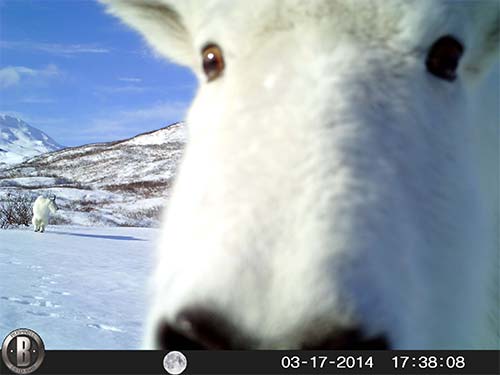 Robin Overall of Kodiak is an avid and skilled trail camera photographer. She shared nine pictures taken on Kodiak, all but one in the spring of 2014. Mountain goats are not native to Kodiak but were introduced in the 1950s and have flourished. Read more about Kodiak Island Mountain Goats at Alaska Fish and Wildlife News.