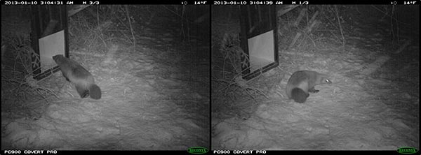 A pair of trail camera images: a wolverine investigates a box-style live trap but doesn’t trigger it.
