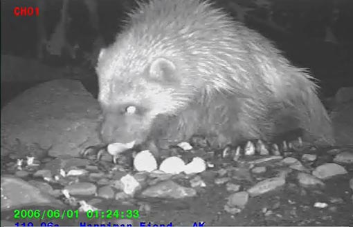An infra-red illuminated night photograph – a wolverine eats three oystercatcher eggs on a beach in Harriman Inlet (oystercatchers are ground nesting shorebirds). A still from a video. View the complete video.