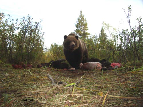 ADF&G wildlife technician Jeff Jemison aimed a remote trail camera at the carcass of a dead moose north of Juneau in the spring of 2010 and drew in a bear that had recently emerged from hibernation.