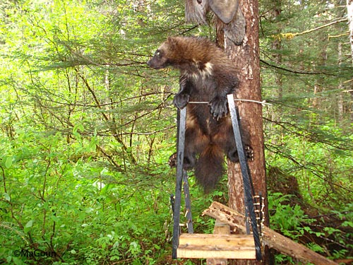 Biologist and wolverine researcher Audrey Magoun worked with captive and wild wolverines to develop this set-up for photo-identifying wolverines. Animals climb the “run pole” and pose as they reach for the attractant above. The markings on the chest and stomach are distinctive, and it’s possible to identify gender, and whether a female is lactating. The small silver clips on the lower edges of the run pole snag bits of fur and hair – the follicles provide DNA which cross references the images.