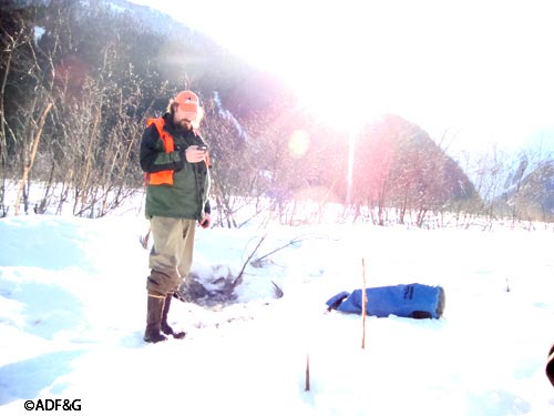 ADF&G wildlife technician Jeff Jemison placed a remote trail camera on the carcass of a dead moose north of Juneau on March 20, 2010.