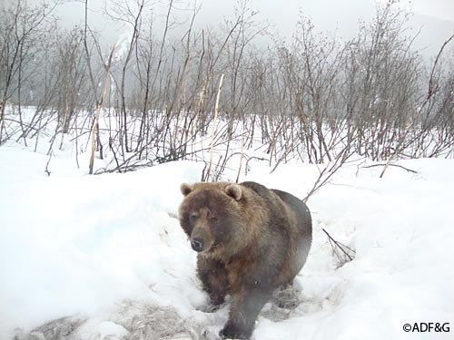 ADF&G wildlife technician Jeff Jemison aimed a remote trail camera at the carcass of a dead moose north of Juneau in the spring of 2010 and drew in a bear that had recently emerged from hibernation.