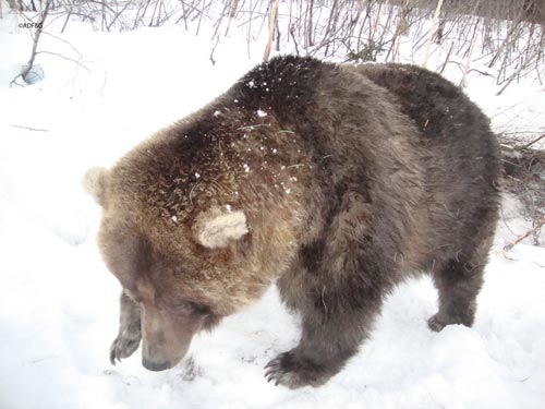 Moose hair and snow adorn the bear.